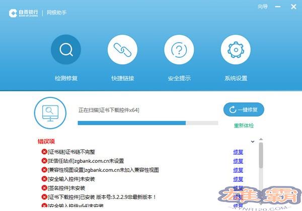 自贡银行网银助手可以帮助用户直接进入网银登录界面,还可以使用一键修复功能安装网银所需的各种安全插件控件,确保用户登录环境符合安全要求,放心登录网银。